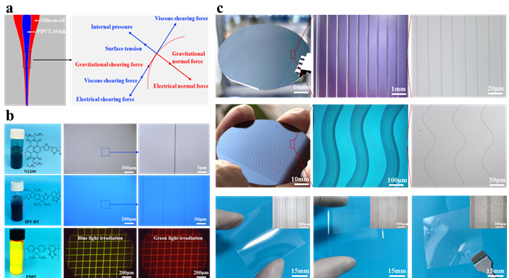有机场效应晶体管(OFETs)是有机电路的基本构筑单元,是实现下一代变革性柔性显示技术、新型光电子集成系统、大规模互补集成电路的器件基元。有机半导体的有序分子堆积可以使有机共轭分子沿电极方向最大程度的重叠,从而提高载流子的传输效率,提升有机场效应晶体管器件性能。但是,如何实现有机半导体的高择优取向加工以及有机场效应晶体管的高质量、高效率制造仍然面临挑战。