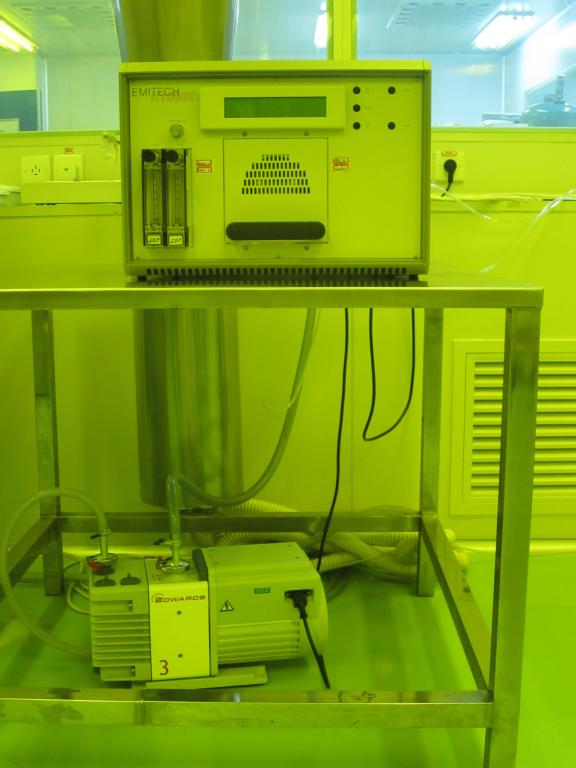 英国Quorum公司的等离子体灰化仪,采用微处理器控制,全自动操作,程序控制。工作气体采用双气体流量控制方式,工作气体可以选用O2、Ar或O2与Ar的混合气体,可用于样品表面无机物杂质和光刻胶的去除、有机材料的微观灰化、有机物及塑料品的表面处理等。真空腔室为圆柱形,包括两个半圆形电极,样品装载为抽屉式抽拉系统,方便使用。设备具有易操作、装卸样品方便等优点。
