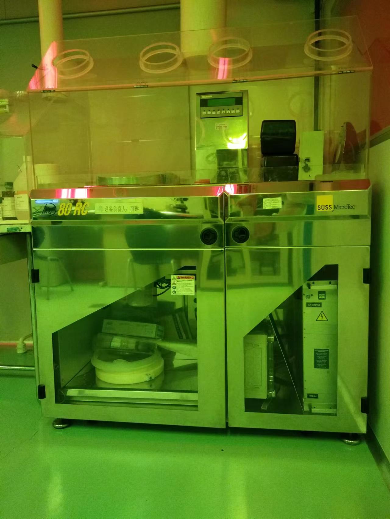 Karl Suss公司的匀胶机具有自动化程度高,运转平稳,匀胶均匀性好等特点。其独特的Gyeset系统能够明显地改善厚胶的均匀性,并且更换方便,尺寸可调。控制系统可存储20条匀胶工艺程序,每条工艺程序最多可分成29个不同转速、加速度以及时间的工艺步骤。对实验室常用的各类正性光刻胶、负性光刻胶均可实现较好的匀胶效果。