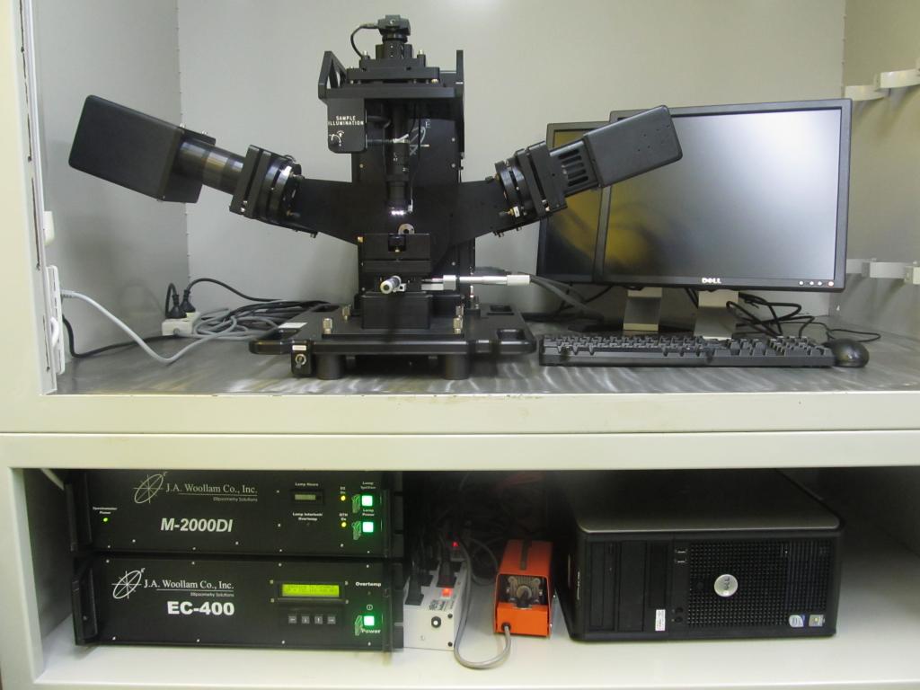 美国J.A.Woollam公司的光谱椭偏仪,用于单层或多层透明或半透明薄膜的厚度和光学常数等的测定,是一种用于薄膜无损分析的智能化仪器,广泛应用于化学、材料、半导体等研究领域。它通过测量反射光偏振态的变化,获得椭偏参数,然后建立样品模型,利用算法模拟光束反射过程中与样品的相互作用来拟合出所测样品的有关特性,如膜厚、折射率、消光系数等。