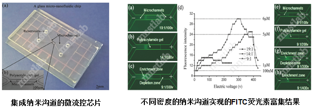 学术研究:提出了一种基于光敏聚合反应的新方法,实现了高密度纳米沟道阵列的原位可控集成。利用研制的芯片,使得FITC荧光素的富集倍率达到了600倍,牛血清蛋白的富集倍率达到了上亿倍。