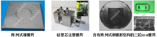 3)SU-8微模具的制造。提出基于过渡粘附效应的新方法和基于牺牲层工艺的新方法,将SU-8模具寿命提高5倍以上,并可制造多层复杂结构的模具。